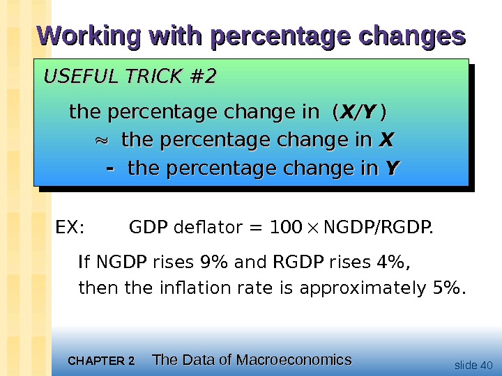 CHAPTER 2 The Data of Macroeconomics slide 40 Working with percentage changes EX: GDP deflator = 100 NGDP/RGDP. If NGDP rises 9% and RGDP rises 4%, then the inflation rate is approximately 5%. USEFUL TRICK #2 USEFUL TRICK #2 the percentage change in (the percentage change in ( XX // YY )) the percentage change in XX the percentage change in YY