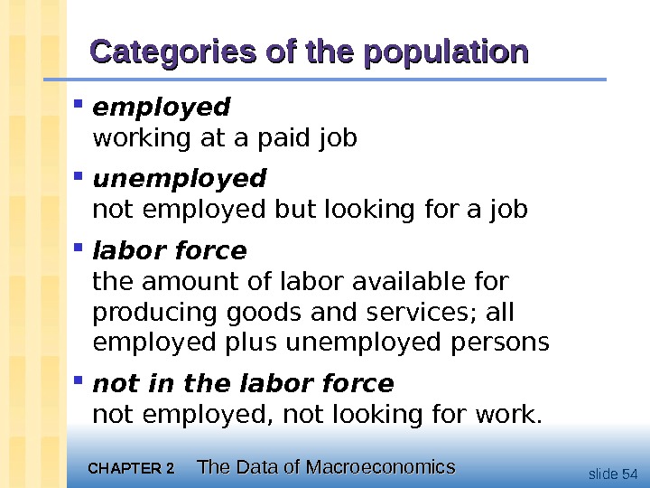 CHAPTER 2 The Data of Macroeconomics slide 54 Categories of the population employed working at a paid job unemployed not employed but looking for a job labor force the amount of labor available for producing goods and services; all employed plus unemployed persons not in the labor force not employed, not looking for work.