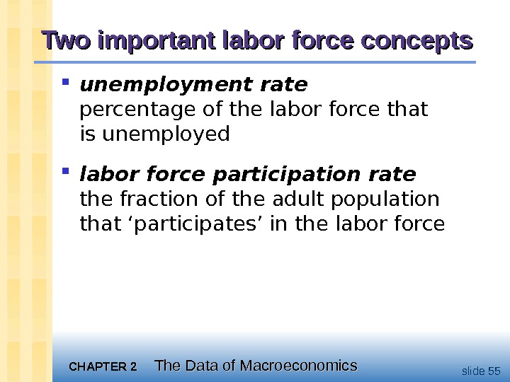 CHAPTER 2 The Data of Macroeconomics slide 55 Two important labor force concepts unemployment rate percentage of the labor force that is unemployed labor force participation rate the fraction of the adult population that ‘participates’ in the labor force