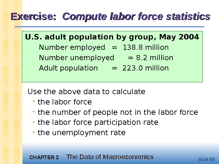 CHAPTER 2 The Data of Macroeconomics slide 56 Exercise: Compute labor force statistics U. S. adult population by group, May 2004 Number employed = 138. 8 million Number unemployed = 8. 2 million Adult population = 223. 0 million Use the above data to calculate • the labor force • the number of people not in the labor force • the labor force participation rate • the unemployment rate