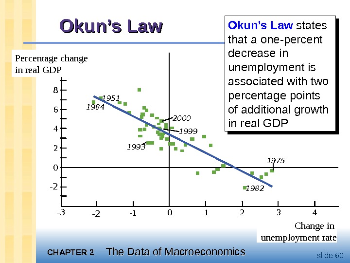 CHAPTER 2 The Data of Macroeconomics slide 59 Employed workers help produce GDP, while unemployed workers do not. So one would expect a negative relationship between unemployment and real GDP. This relationship is clear in the data… Okun’s Law