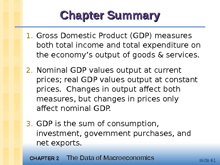 CHAPTER 2 The Data of Macroeconomics slide 61 Chapter Summary 1. Gross Domestic Product (GDP) measures both total income and total expenditure on the economy’s output of goods & services. 2. Nominal GDP values output at current prices; real GDP values output at constant prices. Changes in output affect both measures, but changes in prices only affect nominal GDP. 3. GDP is the sum of consumption, investment, government purchases, and net exports.