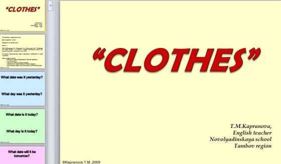 Презентация Clothes о одежде на английском языке. В докладе вы познакомитесь поближе с лексическим материалом по теме одежда. Автор рассказа предлагает вам повторить лексику по теме погода, повторить правила образования степеней сравнения, а также сформировать навыки монологической и диалогической речи. Презентация рекомендуется для урока английского языка.