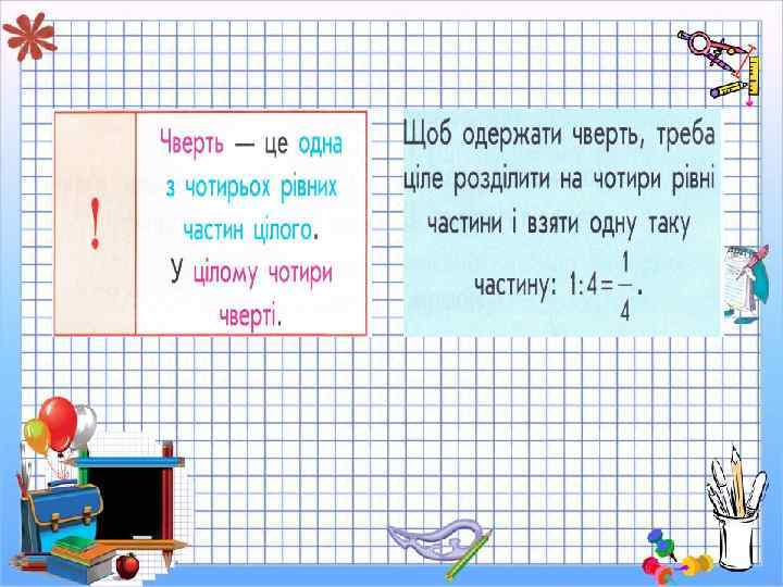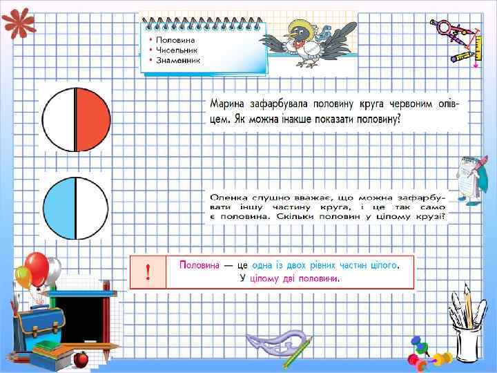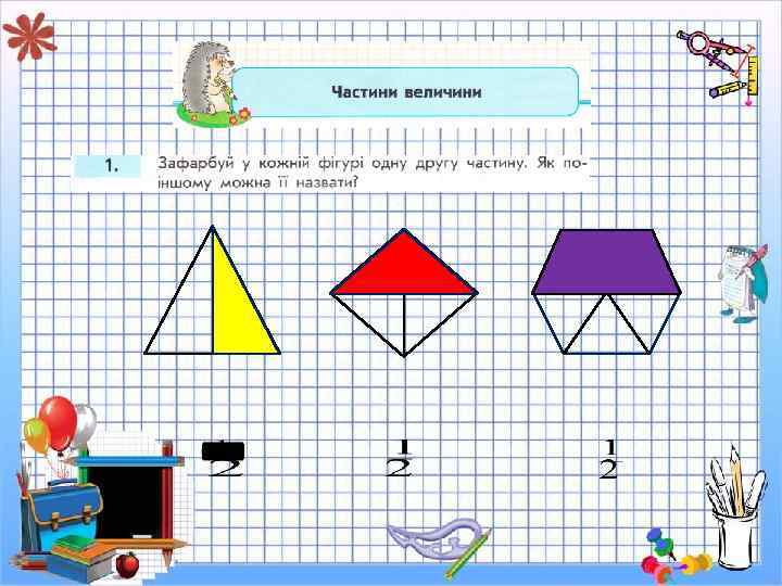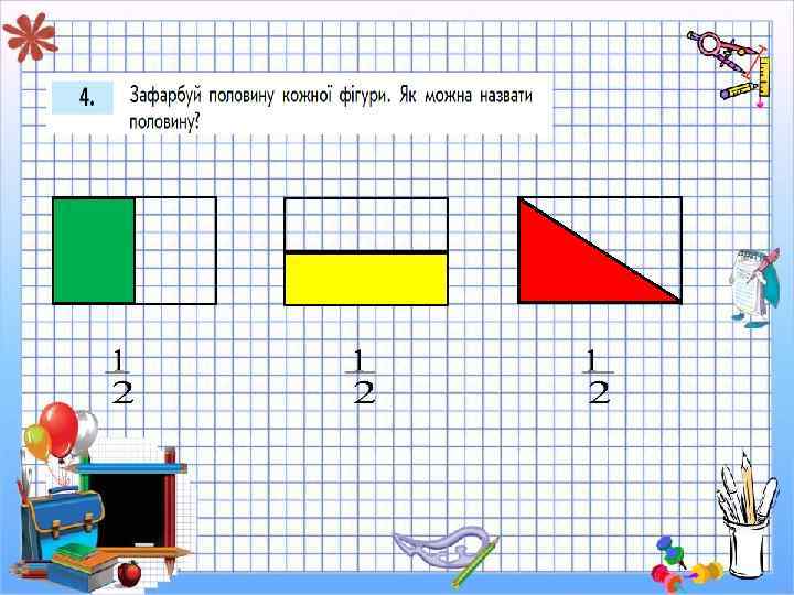 1: 2= 1 2 Ціле поділити на 2 рівні частини