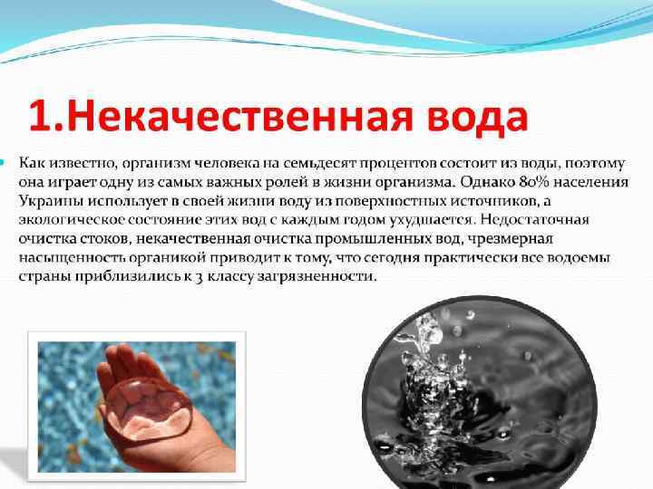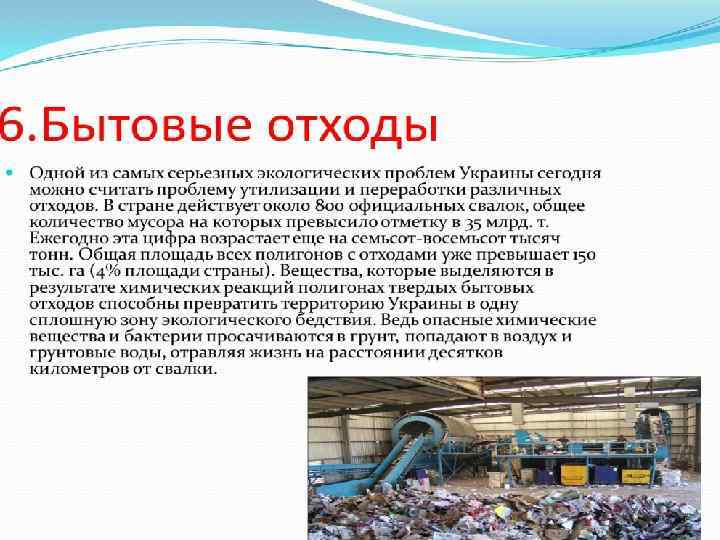 Экологическая ситуация в Украине • На пороге XXI века экологические проблемы приобрели статус глобальных. Человечество осознает опасность сокращения жизни на Земле из-за своего влияния на масштабы природопользования, интенсивность хозяйства, загрязнение природной среды. Однако чувство тревоги за качество последнего свойственно далеко не каждому из нас, жителей города и села, где находятся основные источники загрязнения атмосферного воздуха, природных вод, почв. Земля, которая питает нас, воздух, которым мы дышим, вода, которую пьем, ежегодно несут огромные потери от необдуманной действия тех, кто ими пользуется. Посмотрите вокруг своего села, города, дачных поселений, во что превращаются чистые ручьи, зеленые рощи - все, что питало народ на протяжении многих веков! Свалка мусора, горы минеральных удобрений или пестицидов, бесхозного оставленных под открытым небом - все это попадает в цепь круговорота веществ. Да и сами мы потом пьем воду, потребляем некачественные продукты, дышим загрязненным воздухом. Всего в Украине в 1992 г. было 10088 млн. м 3 промышленных, 3510, 5 млн. м 3 сельскохозяйственных, 3846, 4 млн. м 3 коммунальных стоков, 10015 тыс. т выбросов в атмосферу, 1680, 4 млн. м 3 твердых отходов промышленных предприятий. Вот что существенно меняет качество природных богатств.