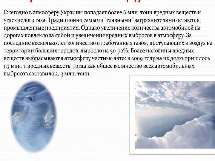 • В Украине динамика загрязнения окружающей среды ухудшается из года в год. По данным Государственной службы статистики, в 2011 году выбросы вредных веществ в атмосферу составили около 6, 8 млн. тонн. При этом со стационарных источников загрязнения поступило 4, 4 млн. тонн, что на 5, 9% больше показателя 2010 года. • Основным передвижным источником загрязнения воздуха в Украине является автотранспорт (90% общего объема выбросов), гораздо меньший вред приносит производственная техника (6, 8%), ж/д. транспорт (2%), авиация (0, 6%) и водный транспорт (0, 3%).