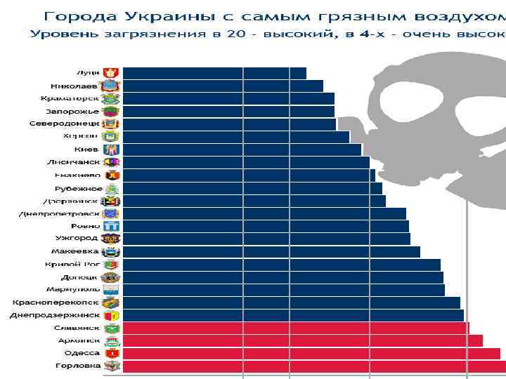 Во многих реках и речушках предельно допустимые концентрации для одного или и нескольких веществ превышены в десятки раз. Например, в притоке Западного Буга г. Полтаве в 20 -35 раз превышена допустимая граница содержания аммонийного азота, из Днепра и Дуная можно добывать цинк (529 ПДК в первом и 18 -23 ПДК во втором). Своеобразными "месторождениями" стали: для меди и фенола p. Тысменица, меди и марганца Южный Буг и Днепр, нефтепродуктов Северский Донец и почти все реки Приазовья. Рекордсменом по совокупности загрязнений признано г. Полтаву. В ее воде ниже Львова долго не появляется кислород, зато наслаждаются потребители сероводорода (того самого, который насыщает глубины Черного моря). Ненамного уступает ей приток Днестра Тысменица, в которой все контролируемые вещества наблюдались в концентрациях, превышающих ПДК. Соперников этих рек можно найти только на Востоке, в Донбассе. Не намного лучше ситуация как в Днепре, так и во всех его украинский притоках. Они загрязнены прежде нитратным и аммонийным азотом и многочисленными соединениями тяжелых металлов. Нижние водохранилища обогащены фенолом, Днепровское нефтепродуктами. Все это следствие сброса стоков, которые попадают в графу "грязных", расплата за слишком развитую промышленность со старыми технологиями и десятилетия советской власти. Несколько лучше ситуация в реках Крыма, вдоль которых нет крупных предприятий. Там только в низовье в 13 раза превышены ПДК азота. На морях максимальные уровни загрязнения сразу несколькими веществами наблюдаются в портах и прилегающей к дельте Дуная части Черного моря. Положительно хотя бы то, что содержание кислорода "удовлетворительное" в обоих морях, а максимальные уровни загрязнения перестали увеличиваться по сравнению с 80 -мы годами XX в.