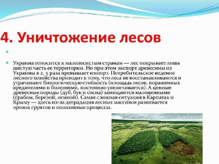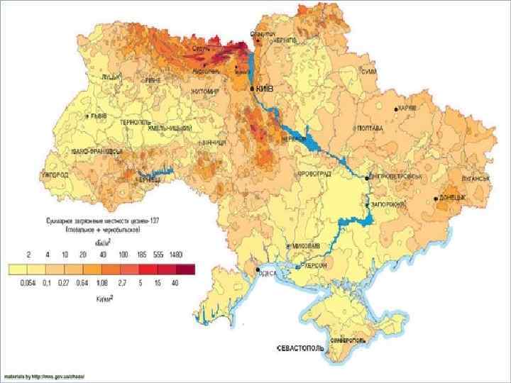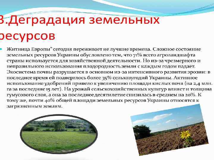 • Добычи полезных ископаемых привело к разрушению 226 тыс. га хозяйственных земель Украины (около 1% всей площади республики), однако ежегодно происходит отчуждение почти 100 тыс. га под новые объекты застройки. Только 1 -2% природных минеральных ресурсов используется для производства продукции, 98% - теряется, накапливаясь в естественной среде в виде отходов, причем каждые 12 -15 лет количество отходов удваивается. Около 4 -5% территории страны потеряно после чернобыльской аварии вследствие радиационного загрязнения земель, большей частью наших лесов пользоваться нельзя. Кроме того, 20% населения Украины проживает в зоне функционирования ЛЭП, т. е. санитарно-недопустимого электромагнитного нагрузки (около 2% территории). Огромные убытки нанесли хозяйству Украины необоснованные мелиоративные мероприятия на севере и юге.