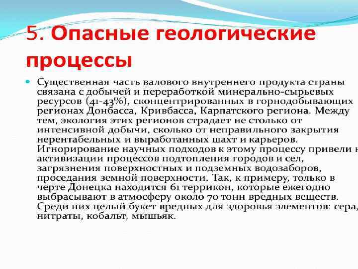 Экологический кризис Донбасса как промышленного района Украины • Донбасс – это крупный промышленный регион Украины, в котором насчитывается несколько тысяч крупных промышленных предприятий, производственно-промышленных объединений и предприятий топливноэнергетического комплекса, горнодобывающей, металлургической, химической промышленности, тяжёлого машиностроения, строительной отрасли, а также агропромышленного комплекса. Донбасс обеспечивает большую часть промышленного производства Украины, причём в наиболее экологически опасных отраслях. Высокая концентрация промышленного и сельскохозяйственного производства, транспортной инфраструктуры, в сочетании с высокой плотностью населения, создали чрезвычайно высокую техногенную и антропогенную нагрузку на биосферу – наивысшую в Украине и Европе. Суммарная техногенная нагрузка на единицу территории региона в 4 раза выше среднего по Украине. Донбасс обладает запасами почти всех химических элементов. Главным природным богатством региона являются месторождения каменного угля. Его запасы только в Донецкой области оцениваются в 25 млрд. т, что может удовлетворить потребности Украины не на одно десятилетие вперёд. •