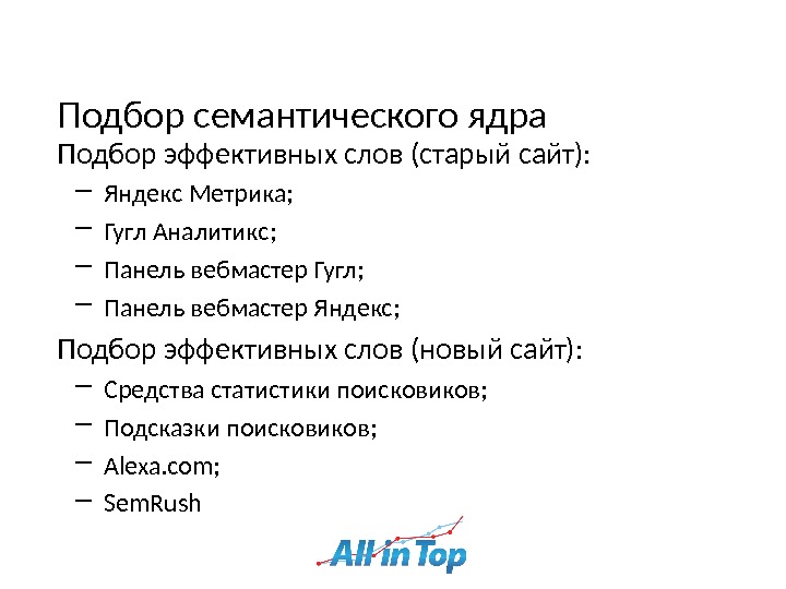 Подбор семантического ядра Подбор эффективных слов (старый сайт): ― Яндекс Метрика ; ― Гугл Аналитикс ; ― Панель вебмастер Гугл ; ― Панель вебмастер Яндекс ; Подбор эффективных слов (новый сайт): ― Средства статистики поисковиков ; ― Подсказки поисковиков ; ― Alexa. com; ― Sem. Rush