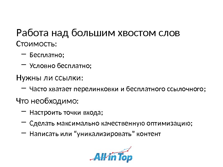 Работа над большим хвостом слов Стоимость: ― Бесплатно ; ― Условно бесплатно ; Нужны ли ссылки: ― Часто хватает перелинковки и бесплатного ссылочного ; Что необходимо: ― Настроить точки входа ; ― Сделать максимально качественную оптимизацию ; ― Написать или “ уникализировать ” контент