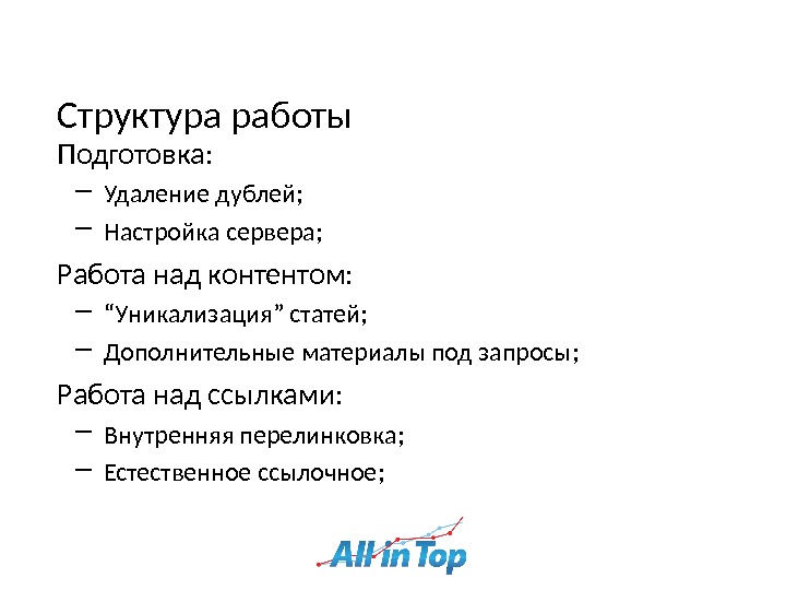 Структура работы Подготовка: ― Удаление дублей ; ― Настройка сервера ; Работа над контентом: ― “ Уникализация ” статей ; ― Дополнительные материалы под запросы ; Работа над ссылками: ― Внутренняя перелинковка ; ― Естественное ссылочное ;