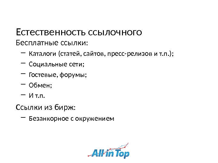 Естественность ссылочного Бесплатные ссылки: ― Каталоги (статей, сайтов, пресс-релизов и т. п. ) ; ― Социальные сети ; ― Гостевые, форумы ; ― Обмен ; ― И т. п. Ссылки из бирж: ― Безанкорное с окружением