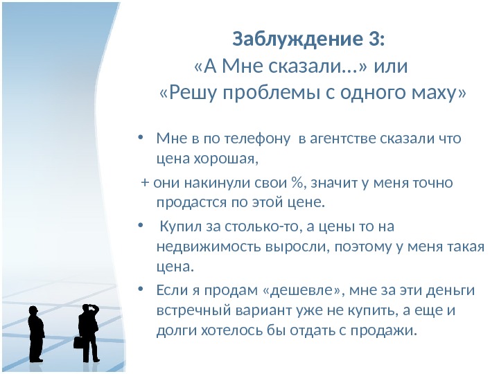 Заблуждение 3: «А Мне сказали…» или «Решу проблемы с одного маху» • Мне в по телефону в агентстве сказали что цена хорошая, + они накинули свои %, значит у меня точно продастся по этой цене. • Купил за столько-то, а цены то на недвижимость выросли, поэтому у меня такая цена. • Если я продам «дешевле» , мне за эти деньги встречный вариант уже не купить, а еще и долги хотелось бы отдать с продажи.