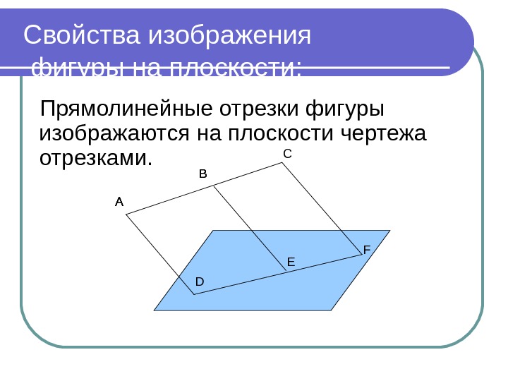 Свойства изображения фигуры на плоскости: Прямолинейные отрезки фигуры изображаются на плоскости чертежа отрезками. А В А С D E FВ А
