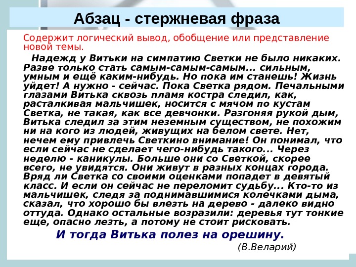 Абзац — стержневая фраза Содержит логический вывод, обобщение или представление новой темы. Надежд у Витьки на симпатию Светки не было никаких. Разве только стать самым-самым. . . сильным, умным и ещё каким-нибудь. Но пока им станешь! Жизнь уйдет! А нужно — сейчас. Пока Светка рядом. Печальными глазами Витька сквозь пламя костра следил, как, расталкивая мальчишек, носится с мячом по кустам Светка, не такая, как все девчонки. Разгоняя рукой дым, Витька следил за этим неземным существом, не похожим ни на кого из людей, живущих на белом свете. Нет, нечем ему привлечь Светкино внимание! Он понимал, что если сейчас не сделает чего-нибудь такого. . . Через неделю — каникулы. Больше они со Светкой, скорее всего, не увидятся. Они живут в разных концах города. Вряд ли Светка со своими оценками попадет в девятый класс. И если он сейчас не переломит судьбу. . . Кто-то из мальчишек, следя за поднимавшимися колечками дыма, сказал, что хорошо бы влезть на дерево — далеко видно оттуда. Однако остальные возразили: деревья тут тонкие еще, опасно лезть, а потому не стоит рисковать. И тогда Витька полез на орешину. (В. Веларий)