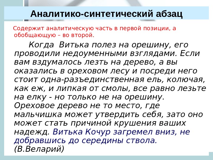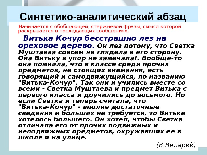 Синтетико-аналитический абзац Начинается с обобщающей, стержневой фразы, смысл которой раскрывается в последующих сообщениях. Витька Кочур бесстрашно лез на ореховое дерево. Он лез потому, что Светка Муштаева совсем не глядела в его сторону. Она Витьку в упор не замечала!. Вообще-то она помнила, что в классе среди прочих предметов, не стоящих внимания, есть говорящий и самодвижущийся, по названию «Витька-Кочур». Так они и учились вместе со всеми — Светка Муштаева и предмет Витька с первого класса и доучились до восьмого. Но если Светка и теперь считала, что «Витька-Кочур» — вполне достаточные сведения и больших не требуется, то Витьке хотелось большего. Он хотел, чтобы Светка отличала его от прочих подвижных и неподвижных предметов, окружавших её в школе и на улице. (В. Веларий)