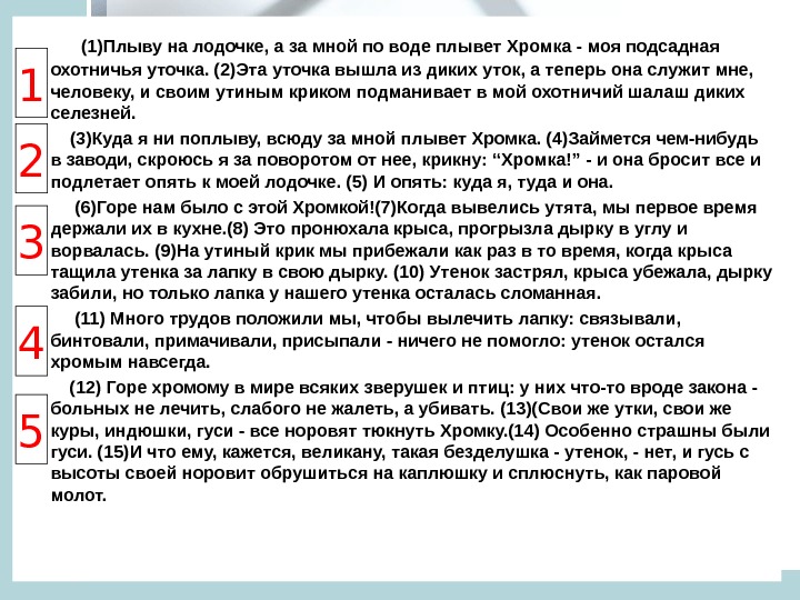 (1)Плыву на лодочке, а за мной по воде плывет Хромка — моя подсадная охотничья уточка. (2)Эта уточка вышла из диких уток, а теперь она служит мне, человеку, и своим утиным криком подманивает в мой охотничий шалаш диких селезней. (3)Куда я ни поплыву, всюду за мной плывет Хромка. (4)Займется чем-нибудь в заводи, скроюсь я за поворотом от нее, крикну: “Хромка!” — и она бросит все и подлетает опять к моей лодочке. (5) И опять: куда я, туда и она. (6)Горе нам было с этой Хромкой!(7)Когда вывелись утята, мы первое время держали их в кухне. (8) Это пронюхала крыса, прогрызла дырку в углу и ворвалась. (9)На утиный крик мы прибежали как раз в то время, когда крыса тащила утенка за лапку в свою дырку. (10) Утенок застрял, крыса убежала, дырку забили, но только лапка у нашего утенка осталась сломанная. (11) Много трудов положили мы, чтобы вылечить лапку: связывали, бинтовали, примачивали, присыпали — ничего не помогло: утенок остался хромым навсегда. (12) Горе хромому в мире всяких зверушек и птиц: у них что-то вроде закона — больных не лечить, слабого не жалеть, а убивать. (13)(Свои же утки, свои же куры, индюшки, гуси — все норовят тюкнуть Хромку. (14) Особенно страшны были гуси. (15)И что ему, кажется, великану, такая безделушка — утенок, — нет, и гусь с высоты своей норовит обрушиться на каплюшку и сплюснуть, как паровой молот.