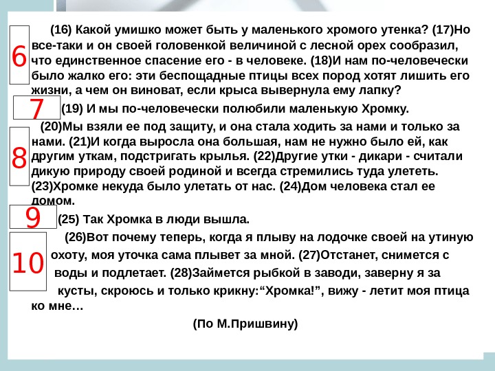 (16) Какой умишко может быть у маленького хромого утенка? (17)Но все-таки и он своей головенкой величиной с лесной орех сообразил, что единственное спасение его — в человеке. (18)И нам по-человечески было жалко его: эти беспощадные птицы всех пород хотят лишить его жизни, а чем он виноват, если крыса вывернула ему лапку? (19) И мы по-человечески полюбили маленькую Хромку. (20)Мы взяли ее под защиту, и она стала ходить за нами и только за нами. (21)И когда выросла она большая, нам не нужно было ей, как другим уткам, подстригать крылья. (22)Другие утки — дикари — считали дикую природу своей родиной и всегда стремились туда улететь. (23)Хромке некуда было улетать от нас. (24)Дом человека стал ее домом. (25) Так Хромка в люди вышла. (26)Вот почему теперь, когда я плыву на лодочке своей на утиную охоту, моя уточка сама плывет за мной. (27)Отстанет, снимется с воды и подлетает. (28)Займется рыбкой в заводи, заверну я за кусты, скроюсь и только крикну: “Хромка!”, вижу — летит моя птица ко мне… (По М. Пришвину)
