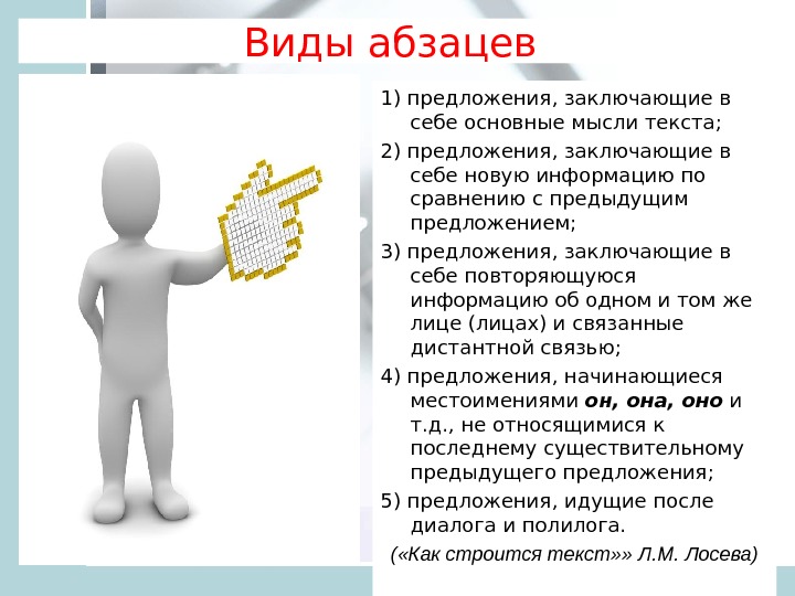 1) предложения, заключающие в себе основные мысли текста; 2) предложения, заключающие в себе новую информацию по сравнению с предыдущим предложением; 3) предложения, заключающие в себе повторяющуюся информацию об одном и том же лице (лицах) и связанные дистантной связью; 4) предложения, начинающиеся местоимениями он, она, оно и т. д. , не относящимися к последнему существительному предыдущего предложения; 5) предложения, идущие после диалога и полилога. ( «Как строится текст» » Л. М. Лосева)Виды абзацев