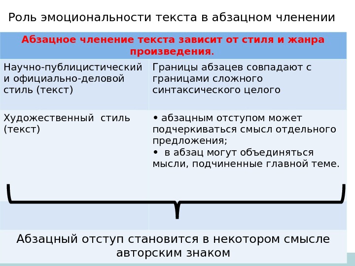 Роль эмоциональности текста в абзацном членении Абзацное членение текста зависит от стиля и жанра произведения. Научно-публицистический и официально-деловой стиль (текст) Границы абзацев совпадают с границами сложного синтаксического целого Художественный стиль (текст) • абзацным отступом может подчеркиваться смысл отдельного предложения; • в абзац могут объединяться мысли, подчиненные главной теме. Абзацный отступ становится в некотором смысле авторским знаком