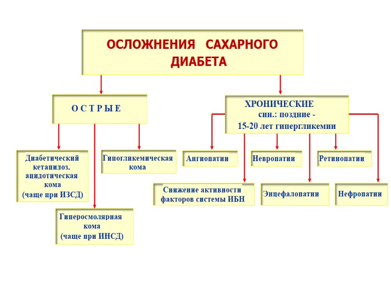 Комы при сахарным диабете: * Сухость кожи и слизистых оболочек * Мышечная гипертония * Судороги * Арефлексия * Артериальная гипотензия * Тахипноэ * Миоз * Гипотония глазных яблок * Запах ацетона в выдыхаемом воздухе * Сухость кожи и слизистых оболочек * Мышечная гипотония * Гипорефлексия * Артериальная гипотензия * Дыхание Куссмауля * Миоз * Гипотония глазных яблок * Двигательное возбуждение * Диспептические явления(рвота) * Артериальная гипотензия (м.б. коллапс) * Брадикардия * Дыхание Куссмауля Гиперосмолярная Кетоацидотическая Лактатацидотическая Патогенетические факторы Проявления