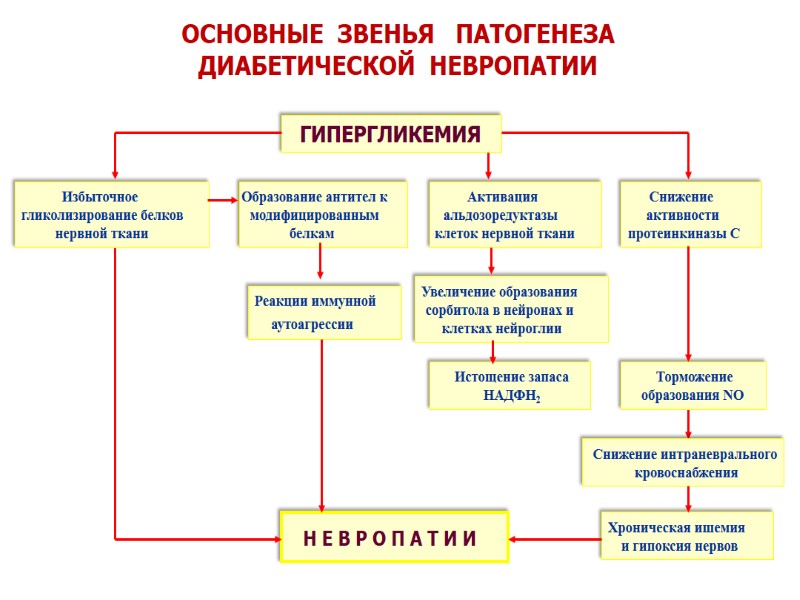 Микро- и макроангиопатии при сахарном диабете Механизмы развития микроангиопатий: - Отложение в сосудистой стенке многоатомных сахароспиртов - сорбита, маннита и др. продуктов восстановления глюкозы; - Гликилирование сосудистой стенки; - Инфильтрация сосудистой стенки белками острой фазы; - ↓ образования эндотелиального релаксирующего фактора -NO ; - ↓ активности Na+/K+ и Са++-зависимой АТФ –азы:стойкая вазоконстрикция; - ↓ анионного заряда эндотелиоцитов, способствующее адгезии тромбоцитов; - ↓ соотношения простациклины/тромбоксаны: микротромбозы….. Механизмы развития макроангиопатий: 1. Отложение холестерина в сосудистой стенке вследствие: - гиперхолестеринемии; ↑ в крови липопротеидов низкой плотности; ↓ в крови фосфолипидов ; - ↓ липолитической активности сосудистой стенки; 2. Активация тромбообразования 3. Пролиферация гладкомышечных клеток сосудистой стенки