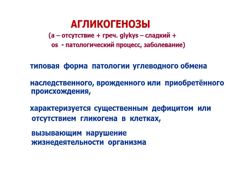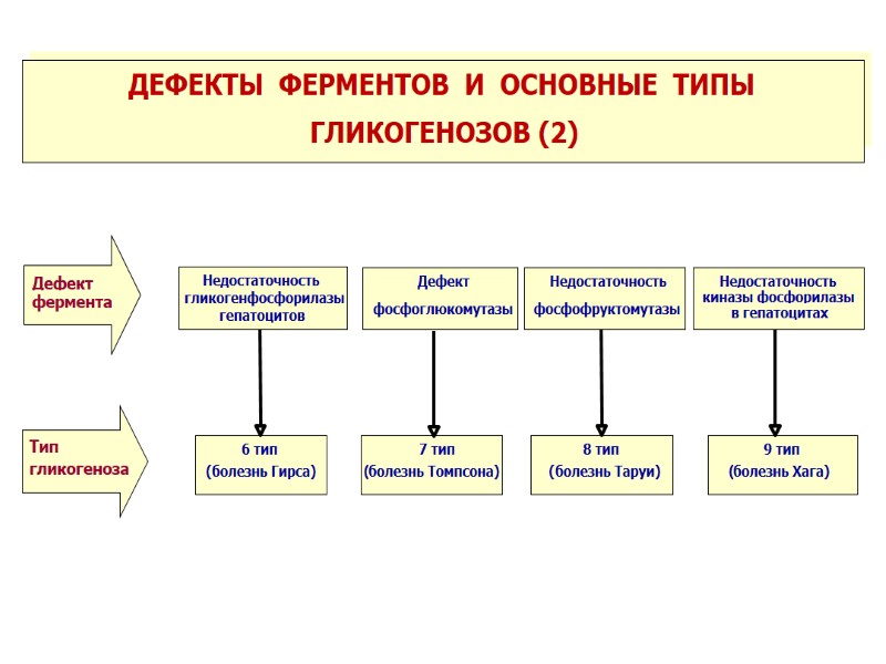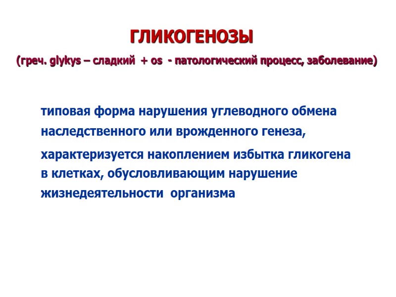 Гипогликемические состояния ВИДЫ Первичные (наследственные): А.НАРУШЕНИЯ ДЕПОНИРОВАНИЯ ГЛИКОГЕНА (АГЛИКОГЕНОЗЫ) *дефицит/блок гликогенсинтетазы Б.НАРУШЕНИЯ РАСЩЕПЛЕНИЯ ГЛИКОГЕНА (ГЛИКОГЕНОЗЫ- “ болезни накопления”): болезнь ГИРКЕ (гликогеноз 1 типа; гепатонефромегальный гликогеноз) *дефицит глюкозо-6 фосфатазы 2. болезнь ПОМПЕ(гликогеноз 2 типа; генерализованный гликогеноз) *дефицит 1,4 глюкозидазы 3. болезнь Мак-Ардля (гликогеноз 5 типа; мышечный гликогеноз) *дефицит мышечной фосфорилазы Вторичные (симптоматические) 1.АЛИМЕНТАРНАЯ *голодание 2.ПЕРЕГРУЗОЧНАЯ *интенсивная физ. нагрузка 3.НЕЙРОГЕННАЯ *стресс *расстройства ВНД 4.ЭНДОКРИННАЯ *инсулома, *надпочечниковая недостаточность (болезнь Аддисона) 5.ПОЧЕЧНАЯ *почечная глюкозурия (наследств. тубулопатия - снижение реабсорбции глюкозы вследствие дефицита глюкозо-6-фосфотазы)