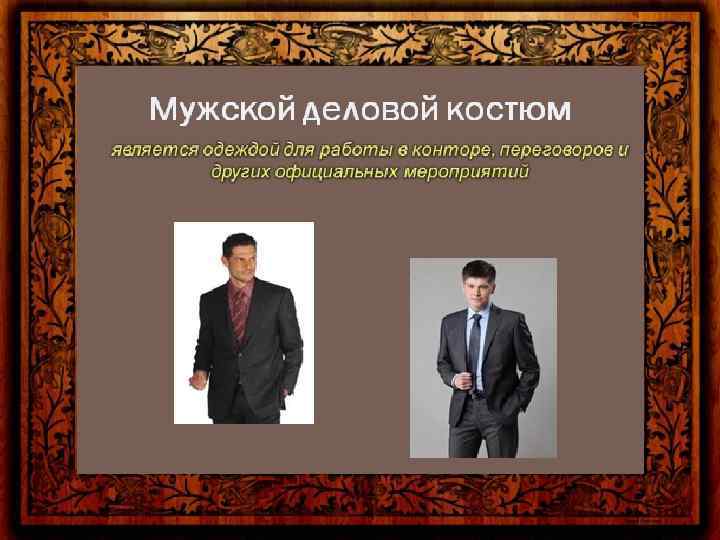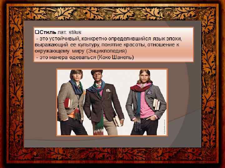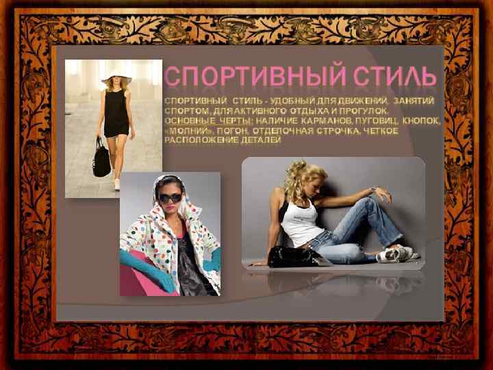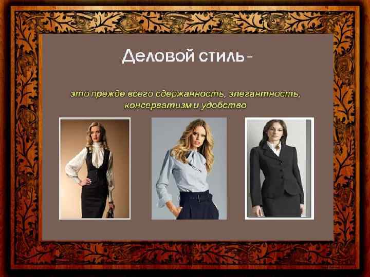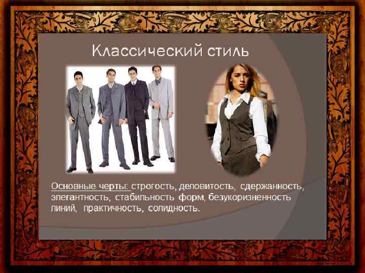 Цветовая гамма и стиль одежды Цветовая гамма предполагает гармоничное сочетание цветов. Следует подбирать цвета так, чтобы они были уместны, и при этом сочетались друг с другом. • Деловой стиль. • Это сдержанный стиль, а потому его цветовая гамма не должна превышать 4 цветов. Лучше всего ограничиться 3 цветами. При необходимости можно использовать 4 цвета, то в этом случае необходимо, чтобы 2 из них были цветами близкими по тону. Лучше всего выбрать многофункциональные цвета. Это серый, бежевый и чёрный. Цвета должны быть сдержанными. Можно остановить выбор на оттенках коричневого, бордовом или изумрудном. • Классический стиль. • Цветовая гамма этого стиля также очень сдержана и не превышает 3 цветов. • Она допускает большее количество оттенков. Для классического стиля характерна элегантность. • Основными цветами этого стиля являются чёрный, серый, коричневый и тёмно-синий. Из светлых цветов в этой цветовой гамме допустимы белый, светло-серый и бежевый. Броские краски и красный цвет исключаются. Преимущество отдаётся сдержанным оттенкам, таким как серо-синий, приглушённый зелёный или оттенки охры.