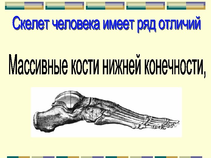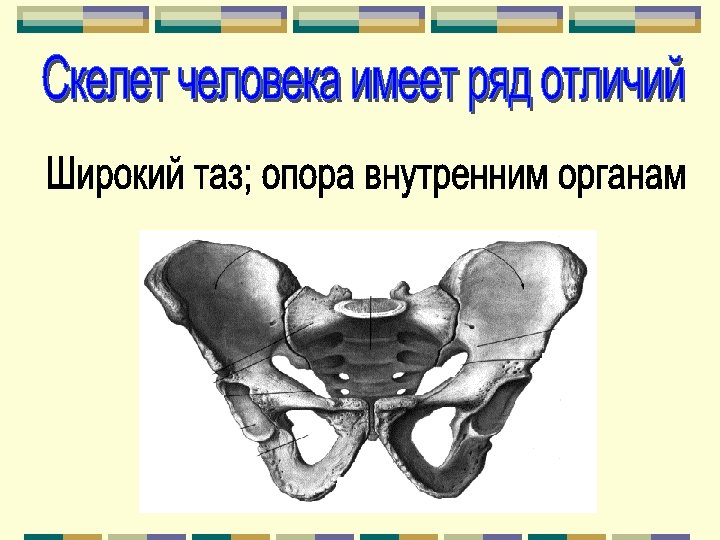 Отделы тела Отделы скелета Кости скелета Нижняя конеч ность Тазовый пояс Парные кости – подвздошные, седалищные, лобковые Свободная Конечность: Бедро Голень Стопа Тип костей Характер соединения костей Особенности скелета человека Плоские Неподвиж ное Расширенная форма таза, широкораставлен ные тазобедренные суставы. Подвижное Мощное развитие костей ног, выпрямленность в коленном суставе, мощное развитие связок Опорная стопа с мощным большим пальцем. Пружинящий свод стопы. Бедренная Длинные трубчатые Большеберцовая малоберцовые Предпл юсны (таранная и короткие пяточная) плюсны фаланги губчатые короткие пальцев трубчатые