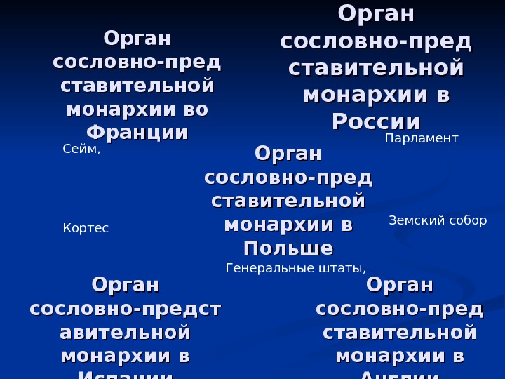 Орган сословно-пред ставительной монархии в Англии. Орган сословно-пред ставительной монархии в России Орган сословно-предст авительной монархии в Испании Орган сословно-пред ставительной монархии в Польше. Орган сословно-пред ставительной монархии во Франции Парламент Генеральные штаты, Сейм, Кортес Земский собор