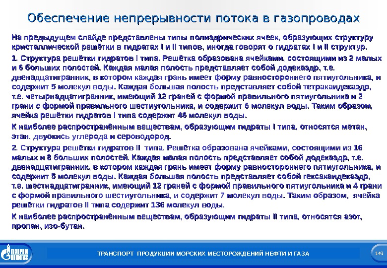 149149 Заголовок презентации. Обеспечение непрерывности потока в газопроводах ТРАНСПОРТ ПРОДУКЦИИ МОРСКИХ МЕСТОРОЖДЕНИЙ НЕФТИ И ГАЗАНа предыдущем слайде представлены типы полиэдрических ячеек, образующих структуру кристаллической решётки в гидратах I I и и IIII типов, иногда говорят о гидратах II и и II II структур. 1. Структура решётки гидратов II типа. Решётка образована ячейками, состоящими из 2 малых и 6 больших полостей. Каждая малая полость представляет собой додекаэдр, т. е. двенадцатигранник, в котором каждая грань имеет форму равностороннего пятиугольника, и содержит 5 молекул воды. Каждая большая полость представляет собой тетракаидекаэдр, т. е. четырнадцатигранник, имеющий 12 граней с формой правильного пятиугольника и 2 грани с формой правильного шестиугольника, и содержит 6 молекул воды. Таким образом, ячейка решётки гидратов II типа содержит 46 молекул воды. К наиболее распространённым веществам, образующим гидраты II типа, относятся метан, этан, двуокись углерода и сероводород. 2. Структура решётки гидратов II II типа. Решётка образована ячейками, состоящими из 16 малых и 8 больших полостей. Каждая малая полость представляет собой додекаэдр, т. е. двенадцатигранник, в котором каждая грань имеет форму равностороннего пятиугольника, и содержит 5 молекул воды. Каждая большая полость представляет собой гексакаидекаэдр, т. е. шестнадцатигранник, имеющий 12 граней с формой правильного пятиугольника и 4 грани с формой правильного шестиугольника, и содержит 7 молекул воды. Таким образом, ячейка решётки гидратов II II типа содержит 136 молекул воды. К наиболее распространённым веществам, образующим гидраты IIII типа, относятся азот, пропан, изо-бутан.