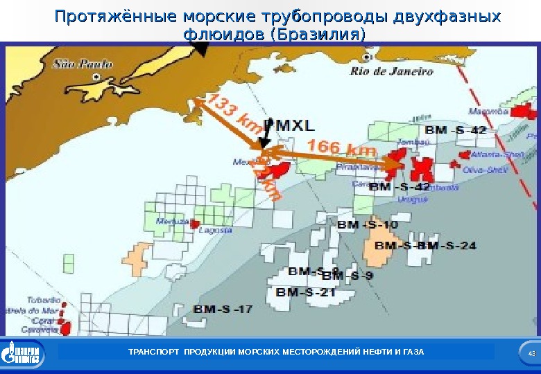 4242 Заголовок презентации 4242 Протяжённые морские трубопроводы двухфазных флюидов (Бразилия) ТРАНСПОРТ ПРОДУКЦИИ МОРСКИХ МЕСТОРОЖДЕНИЙ НЕФТИ И ГАЗАСамый глубоководный трубопровод в Бразилии берёт свой начало от FPSO на на месторождении Lula ( глубина морского дна 2145 м) и заканчивается выходом в систему газопроводов компании Petrobras , которая находится в окрестности платформы Mexilhao (глубина морского дна 172 м). Протяжённость этого трубопровода 210 км, диаметр труб 18 дюймов (457, 2 мм), проектная пропускная способность 10 млн. кубических метров сырого газа в день. Далее сырой газ месторождения Lula по трубопроводу «платформа Mexilhao – Monteiro Lobato » вместе с сырым газом месторождения Mexilhao поступает на береговую УКПГ. Протяжённость этого трубопровода 133 км, диаметр труб 34 дюйма (853, 6 мм).