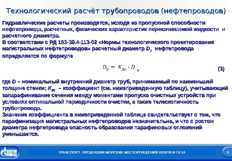 8686 Заголовок презентации. Технологический расчёт трубопроводов (нефтепроводов) ТРАНСПОРТ ПРОДУКЦИИ МОРСКИХ МЕСТОРОЖДЕНИЙ НЕФТИ И ГАЗАГидравлические расчеты производятся, исходя из пропускной способности нефтепровода, расчетных, физических характеристик перекачиваемой жидкости и расчетного диаметра. В соответствии с РД 153 -39. 4 -113 -02 «Нормы технологического проектирования магистральных нефтепроводов» расчетный диаметр DD рр нефтепровода определяется по формуле , , (3) где DD – номинальный внутренний диаметр труб, принимаемый по наименьшей толщине стенки; KK роро – коэффициент (см. нижеприведенную таблицу), учитывающий запарафинивание сечения между моментами пропуска очистных устройств при условиях оптимальной периодичности очистки, а также телескопичность трубопровода. Значение коэффициента в нижеприведенной таблице свидетельствует о том, что парафинизация магистральных нефтепроводов незначительна, и что с ростом диаметра нефтепровода опасность образования парафиновых отложений уменьшается.