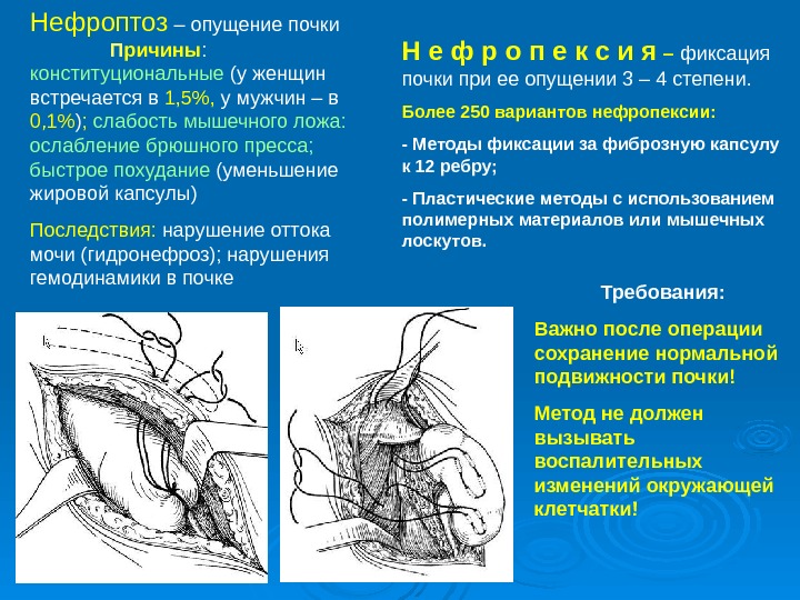 Н е ф р о п е к с и я – фиксация почки при ее опущении 3 – 4 степени. Более 250 вариантов нефропексии: — Методы фиксации за фиброзную капсулу к 12 ребру; — Пластические методы с использованием полимерных материалов или мышечных лоскутов. Нефроптоз – опущение почки П ричины : конституциональные (у женщин встречается в 1, 5%, у мужчин – в 0, 1% ) ; слабость мышечного ложа: ослабление брюшного пресса; быстрое похудание (уменьшение жировой капсулы) Последствия: нарушение оттока мочи (гидронефроз); нарушения гемодинамики в почке Требования: Важно после операции сохранение нормальной подвижности почки! Метод не должен вызывать воспалительных изменений окружающей клетчатки!