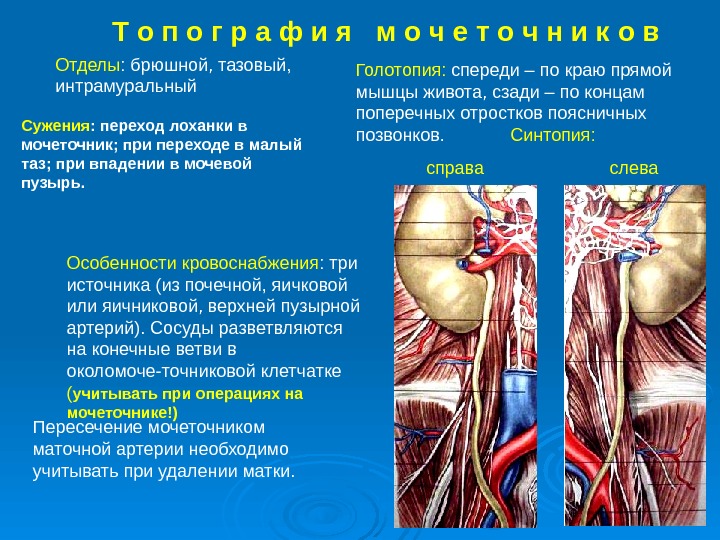 Т о п о г р а ф и я м о ч е т о ч н и к о в Сужения : переход лоханки в мочеточник; при переходе в малый таз; при впадении в мочевой пузырь. Голотопия: спереди – по краю прямой мышцы живота, сзади – по концам поперечных отростков поясничных позвонков. Синтопия: справа слева. Отделы : брюшной, тазовый, интрамуральный Особенности кровоснабжения : три источника (из почечной, яичковой или яичниковой, верхней пузырной артерий). Сосуды разветвляются на конечные ветви в околомоче-точниковой клетчатке ( учитывать при операциях на мочеточнике!) Пересечение мочеточником маточной артерии необходимо учитывать при удалении матки.