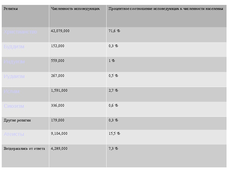 Религия Численностьисповедующих Процентноесоотношениеисповедующихкчисленностинаселения Христианство 42, 079, 000 71, 6% Буддизм 152, 000 0, 3% Индуизм 559, 000 1% Иудаизм 267, 000 0, 5% Ислам 1, 591, 000 2, 7% Сикхизм 336, 000 0, 6% Другие религии 179, 000 0, 3% Атеисты 9, 104, 000 15, 5% Воздержались отответа 4, 289, 000 7, 3%