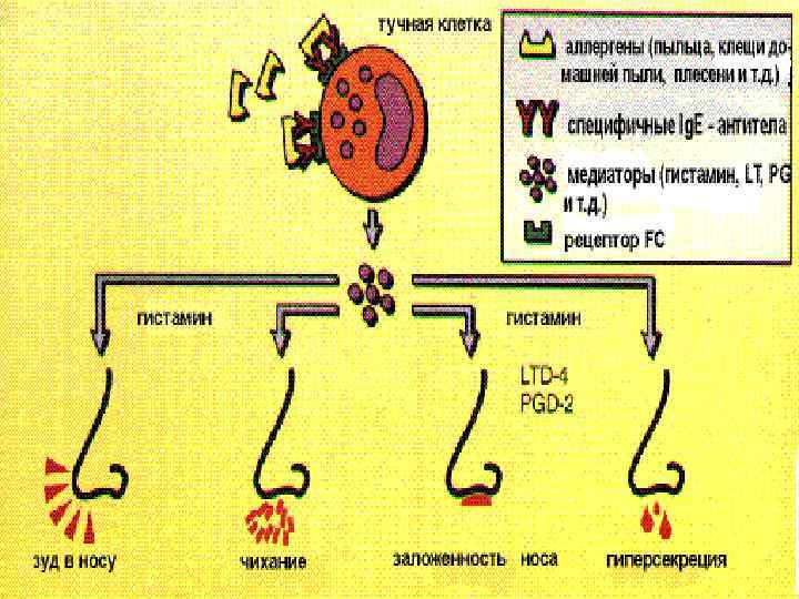 Патогенез реакции гиперчувствительности I типа состоит из фазы острого и замедленного ответа. Фаза острого ответа Основное различие реакции гиперчувствительности I типа от нормального иммунного ответа на аллерген состоит в чрезмерной секреции Ig. E плазмоцитами. Ig. E связываются с Fc рецептором на поверхности мастоцитов и базофилов, участвующих в развитии острого аллергического ответа. Чувствительность организма развивается во время связывания первично секретированных Ig. E с рецепторами Fc на поверхности мастоцитов и базофилов. Последующий контакт с тем же специфическим аллергеном приводит к реактивации Ig. E, что служит сигналом к дегрануляции чувствительных мастоцитов и базофилов. Гранулы этих клеток выделяют гистамин и другие медиаторы воспаления ( цитокины , интерлейкины, лейкотриены и простагландины) в окружающие ткани, вызывая развитие определённых процессов: вазодилатация, секреция слизи, раздражение нервных окончаний и сокращение гладких мышц в стенках сосудов и внутренних органов. Что проявляется в виде нижеупомянутых симптомов: насморк , зуд, одышка и анафилаксия, а также формирования очага воспаления в зоне проникновения аллергена.
