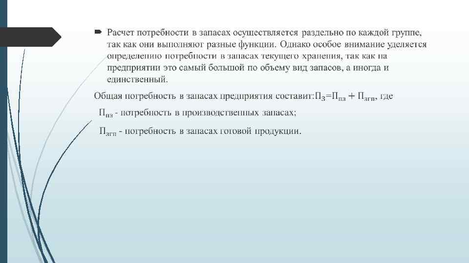 Потребность в запасах и методика её расчета Определение потребности в запасах является составной частью политики управления ими. Оно позволяет выявить общую потребность в финансовых ресурсах, авансируемых в формирование запасов, т. е. определить размер оборотных активов, обслуживающих эту стадию производственно – коммерческого цикла.