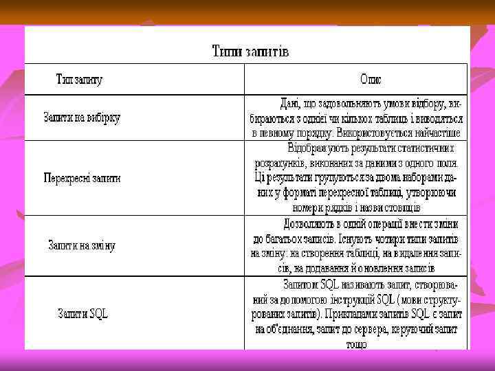 Запити «Ну і запити у вас!» сказала база даних и «зависла» . (Фольклор) Запит – це звернення до СКБД для виконання яких небудь операцій з даними. Типи запитів: • вибірка • створення таблиці • обновлення (зміна даних) • добавлення записів • вилучення записів