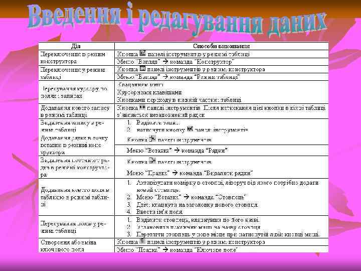 Переміщення по таблиці n n n n n Shift+Tab попереднє поле Tab наступне поле End останнє поле в записі Home перше поле в записі те саме поле в наступному записі те саме поле в попередньому записі Ctrl+ те саме поле в останньому записі Ctrl+ те саме поле в першому записі Ctrl+End останнє поле в останньому записі Ctrl+Home первое поле в першому записі