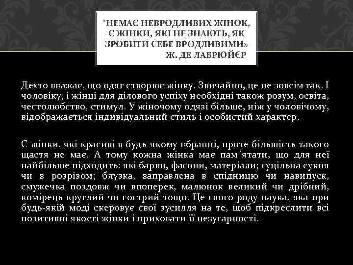 "НЕМАЄ НЕВРОДЛИВИХ ЖІНОК, Є ЖІНКИ, ЯКІ НЕ ЗНАЮТЬ, ЯК ЗРОБИТИ СЕБЕ ВРОДЛИВИМИ» Ж. ДЕ ЛАБРЮЙЄР Дехто вважає, що одяг створює жінку. Звичайно, це не зовсім так. І чоловіку, і жінці для ділового успіху необхідні також розум, освіта, честолюбство, стимул. У жіночому одязі більше, ніж у чоловічому, відображається індивідуальний стиль і особистий характер. Є жінки, які красиві в будь-якому вбранні, проте більшість такого щастя не має. А тому кожна жінка має пам´ятати, що для неї найбільше підходить: які барви, фасони, матеріали; суцільна сукня чи з розрізом; блузка, заправлена в спідницю чи навипуск, смужечка поздовж чи впоперек, малюнок великий чи дрібний, комірець круглий чи гострий тощо. Це свого роду наука, яка при будь-якій моді скеровує свої зусилля на те, щоб підкреслити всі позитивні якості жінки і приховати її незугарності.