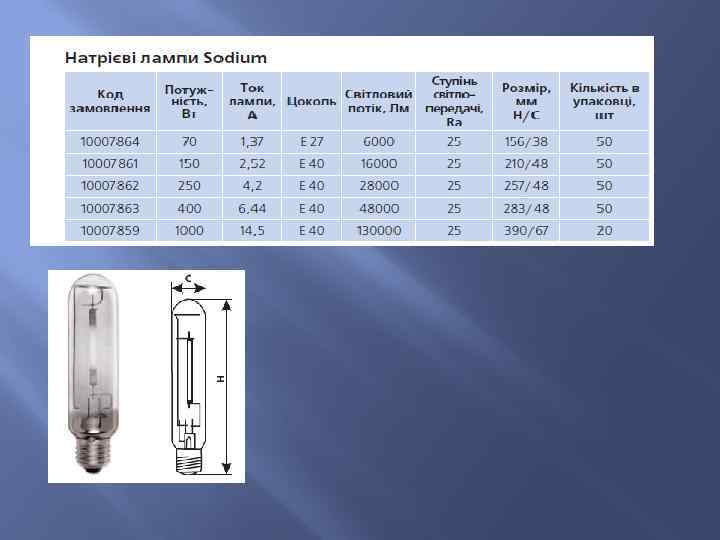 7. Приклади промислових зразків Характеризуються тривалим терміном свічення і високою світловіддачею протягом усього терміну експлуатації, що робить їх найбільш економними газорозрядними лампами високого тиску. • Призначені для внутрішнього освітлення великих площ, спортивних залів, теплиць та зовнішнього освітлення доріг, вулиць, житлових секторів. • Працюють в мережах змінного струму частотою 50 Гц разом з баластним дроселем та зовнішнім запалювальним пристроєм.