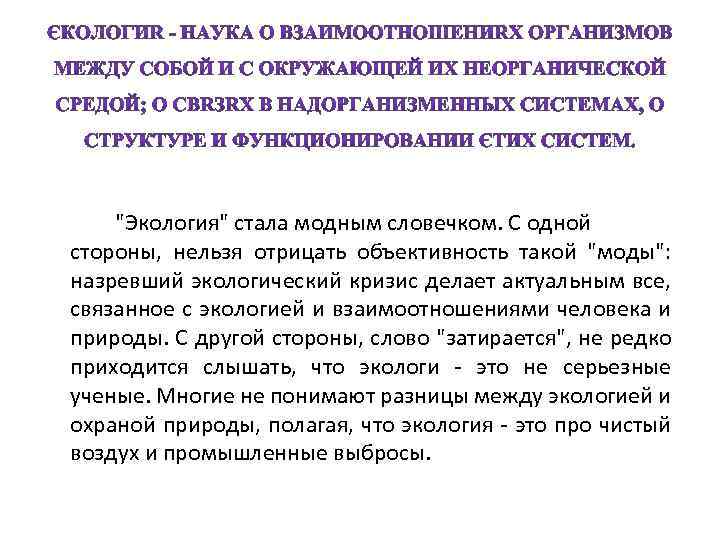 "Экология" стала модным словечком. С одной стороны, нельзя отрицать объективность такой "моды": назревший экологический кризис делает актуальным все, связанное с экологией и взаимоотношениями человека и природы. С другой стороны, слово "затирается", не редко приходится слышать, что экологи - это не серьезные ученые. Многие не понимают разницы между экологией и охраной природы, полагая, что экология - это про чистый воздух и промышленные выбросы.