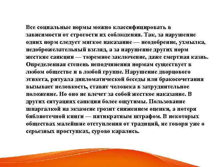 Все социальные нормы можно классифицировать в зависимости от строгости их соблюдения. Так, за нарушение одних норм следует мягкое наказание — неодобрение, ухмылка, недоброжелательный взгляд, а за нарушение других норм жесткие санкции — тюремное заключение, даже смертная казнь. Определенная степень неподчинения нормам существует в любом обществе и в любой группе. Нарушение дворцового этикета, ритуала дипломатической беседы или бракосочетания вызывает неловкость, ставит человека в затруднительное положение. Но оно не влечет за собой жесткое наказание. В других ситуациях санкции более ощутимы. Пользование шпаргалкой на экзамене грозит снижением оценки, а потеря библиотечной книги — пятикратным штрафом. В некоторых обществах малейшие отступления от традиций, не говоря уже о серьезных проступках, сурово карались.