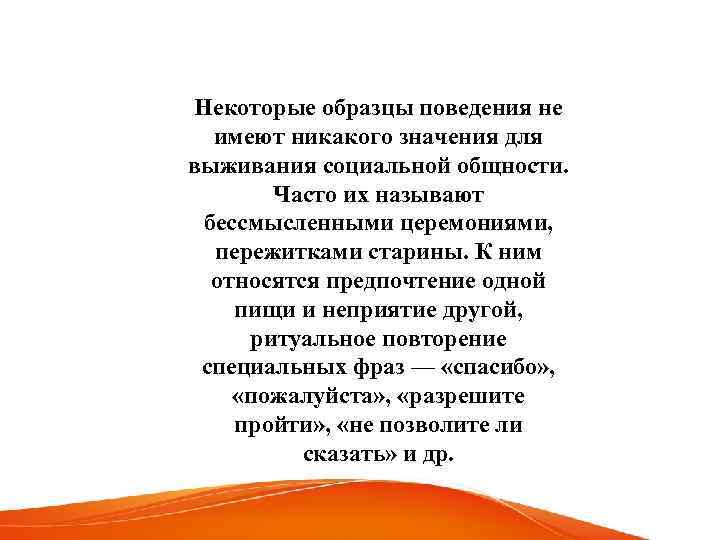 Некоторые образцы поведения не имеют никакого значения для выживания социальной общности. Часто их называют бессмысленными церемониями, пережитками старины. К ним относятся предпочтение одной пищи и неприятие другой, ритуальное повторение специальных фраз — «спасибо» , «пожалуйста» , «разрешите пройти» , «не позволите ли сказать» и др.