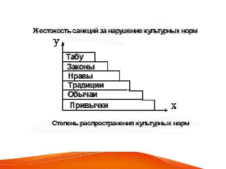Типология культурных норм На оси ОУ, изображающей степень жесткости санкций, применяемых за нарушение культурных норм. Как видим, чем больше санкций, тем строже наказание за нарушение нормы. Вдоль оси ОХ отмечена степень распространенности культурных норм в обществе. Самыми популярными являются привычки, а самыми редкими — табу. Рассмотрев горизонтальную прямую, заметим еще одну любопытную закономерность: чем мягче наказание за нарушение культурной нормы, тем шире она используется, и наоборот.