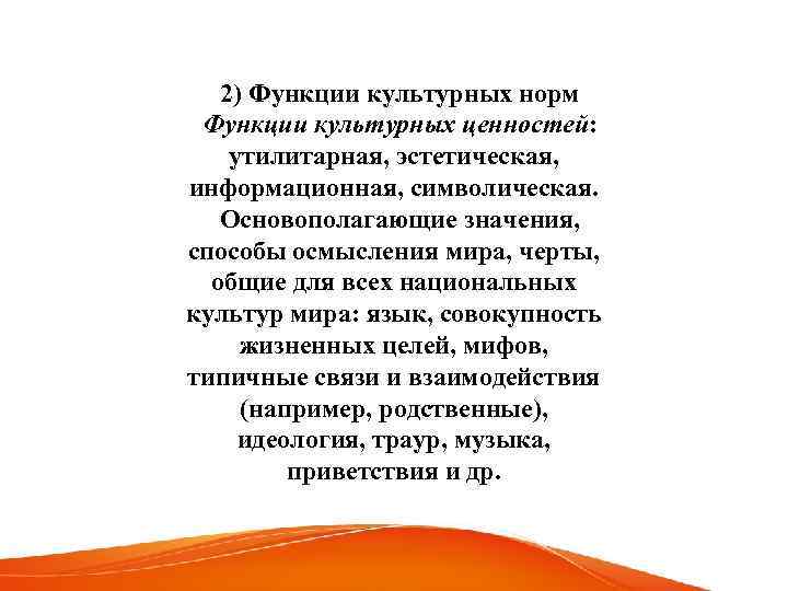 2) Функции культурных норм Функции культурных ценностей: утилитарная, эстетическая, информационная, символическая. Основополагающие значения, способы осмысления мира, черты, общие для всех национальных культур мира: язык, совокупность жизненных целей, мифов, типичные связи и взаимодействия (например, родственные), идеология, траур, музыка, приветствия и др.