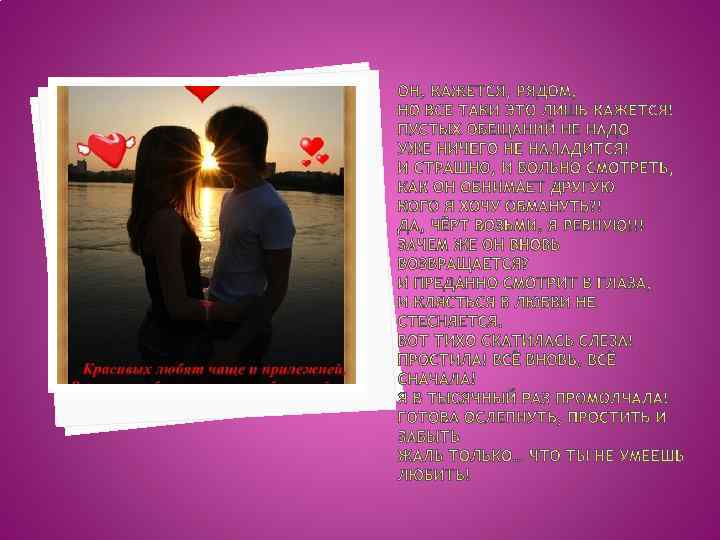 Зачем так поступаешь? Ведь знаешь, что люблю! Идёшь - не замечаешь. За что так? Почему? Быть может всё впустую И вместе нам не быть. Но ты пойми: ЛЮБЛЮ я! И не могу забыть! Прекрасно понимаю, Что ты только играл. Но как мне быть - не знаю. Ведь сердце ты забрал!