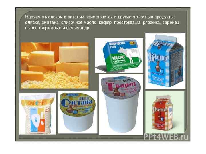 2. Самыми известными кисломолочными продуктами являются: простокваша – самый простой продукт, представляющий собой просто закисшее молоко без всяких добавок. Это – самый древний из известных человеку кисломолочных продуктов; творог. По сути, творог – эта та же простокваша, из которой отжата жидкая часть молока – сыворотка. сыр – молочное изделие, получаемое после термической обработки творога; сметана – прокисшие сливки. Как правило, для лучшего закисания жирных сливок к ним добавляют специальную закваску. Хотя и без неё сметана получается отменной; кефир и йогурт – близкие друг к другу продукты, получаемые сквашиванием молока, из которого предварительно были удалены сливки. Только приготовлении кефира используют целый набор бактерий, дрожжей и палочек, а при получении йогурта всё дело доверяют обычным молочнокислым бактериям; ряженка – продукт брожения топлёного молока; айран – йогурт, в который вместо подсластителей и ароматизаторов добавляют соль; кумыс – простокваша, приготовленная из кобыльего и верблюжьего молока соответственно.